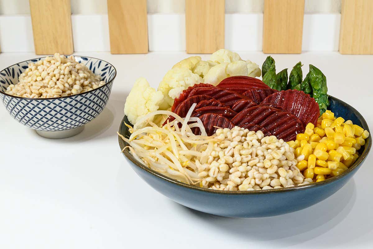 Pokè d’orzo, asparagi e mais con barbabietole, cavolfiori e germogli
