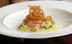 La ricetta proposta dallo chef Gerhard WieserUovo di coltura in pieno campo, formaggio dello Stelvio, purea di patate e cipolla fritta