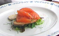 La ricetta proposta dallo chef Claudio MelisTrota marmorata marinata alla grappa di pino cembro; pane di segale e burro al ginepro