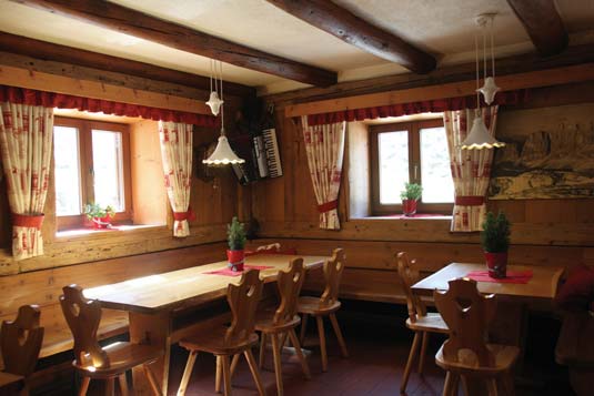 Il rifugio, completamente rivestito in legno, è il luogo ideale per riscoprire il fascino delle usanze e tradizioni alpine, anche nell'architettura. la terrazza con vista panoramica, da dove sembra si possa toccare la Marmolada con un dito, rappresenta il fiore all'occhiello della baita.