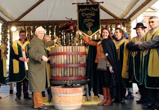 Torcolato e folclore a Breganze per la spremitura in piazzaBreganze festeggia il Torcolato Beppe Bigazzi alla spremitura