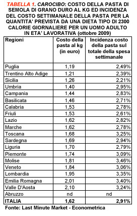 Lo scorso ottobre il prezzo della pasta in Italia si attestava a 1,62 euro/kg. Si tratta di un valore ottenuto dalla media dei listini regionali, che si distinguono per un'elevata variabilità. Infatti, come mostra la tabella 1, si passa dal prezzo medio di 1,19 euro/kg della Puglia al prezzo medio di 2,10 euro/kg della Valle D'Aosta.