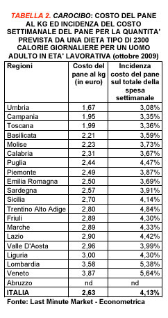 Una situazione analoga si riscontra anche per il pane. Il prezzo medio nazionale è di 2,63 euro/kg ed anche in questo caso la variabilità tra regione e regione è molto elevata. La forbice che ne consegue va dai 1,67 euro/kg dell'Umbria ai 3,87 euro/kg del Veneto.