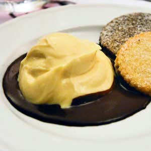 Servire con cioccolato fondente sciolto a bagnomaria con il latto finché diventa liquido. Guarnire con biscotti frollini e zucchero a velo.