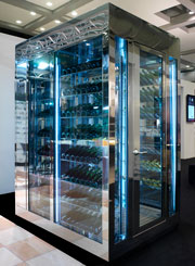 La cantinetta vini a due (o più) temperature interne di Afa Arredamenti (www.afa-arredamenti.com) è realizzata con struttura e lamiere di acciaio Inox Aisi 304 sp. 20/10 e 8/10 lucido in parte saldate fra loro. I vetri esterni, compresa la porta, hanno spessore 30 mm in vetrocamera con gas interno anticondensa, mentre i vetri interni comprese le due porte scorrevoli sono sp. 5+5 mm uniti da microfilm. La refrigerazione della vetrina avviene per mezzo di evaporatori a soffitto e di ventilatori tangenziali che convogliano l'aria verso il basso della vetrina stessa, il tutto coperto da griglie visibili internamente alla cella a soffitto; in più sono stati impiegati due evaporatori e quattro ventilatori tangenziali per ogni vano.
