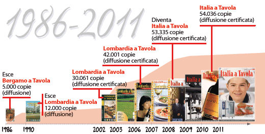 Nell'aprile del 1986 usciva la prima rivista, 'Bergamo a Tavola”, diretta da Roberto Vitali (clicca qui per leggere il suo primo editoriale), sostituita 4 anni dopo da 'Lombardia a Tavola” (clicca qui per leggere il primo editoriale pubblicato su Lombardia a Tavola), testata storica che dal 2002, sotto la direzione di Alberto Lupini (clicca qui per leggere il suo primo editoriale), ha avviato una strategia di riposizionamento ampliando progressivamente la foliazione e assumendo una nuova veste grafica.