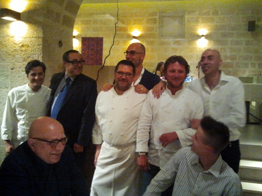 L’agenzia Tres di Gianluca Martello, Gigi Valerio e Paolo Lentini ci ha preso gusto. Un paio di mesi fa ha organizzato una cena a quattro mani con lo chef andriese Felice Sgarra (nella foto, il primo da sinistra) e con lo chef barese Antonio Scalera (nella foto il quarto da sinistra), due eccellenti interpreti del nuovo corso della cucina pugliese. Io c’ero e fu davvero una bella serata. Il 19 giugno scorso, poi, unendo alla coppia Sgarra-Scalera lo chef monopolitano Angelo Sabatelli (nella foto, il terzo da sinistra), il duo è diventato un trio per - come si usa dire - una cena a sei mani, fatta da interpreti di una cucina che definirei emozionale, con al centro il territorio e i grandi prodotti della Puglia.