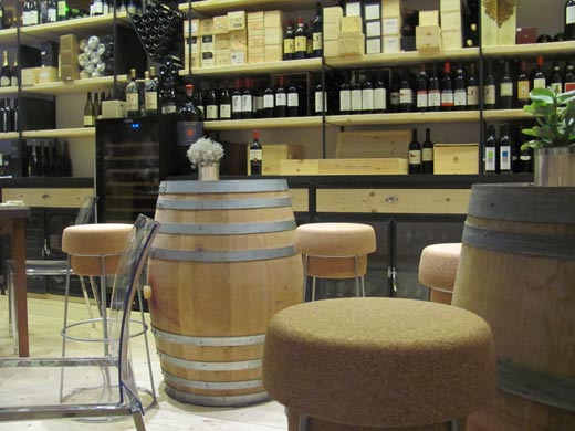 La location è ottima. Un quartiere tranquillo, parcheggio agevole, ingresso invitante con spazio verde all’aperto, interno giocato sui colori del beige, del legno e del ferro. Singolari, nella zona enoteca, gli sgabelli con sedile a forma di tappo. Entusiasmante una parete intera ricoperta da scaffali colmi di bottiglie (e che vini…) per complessive 450 etichette.