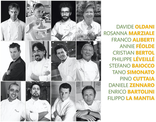 I magnifici dodici che hanno aderito con entusiasmo al progetto sono: Franco Aliberti, Stefano Baiocco, Enrico Bartolini, Cristian Bertol, Pino Cuttaia, Annie Féolde, Filippo La Mantia, Philippe Léveillé, Rosanna Marziale, Davide Oldani, Tano Simonato, Daniele Zennaro.