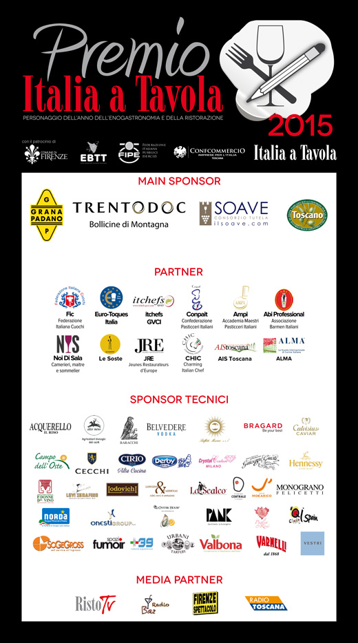 Main sponsor dell’iniziativa sono stati Consorzio Grana Padano, Trentodoc, Consorzio Tutela Vini Soave e Consorzio Olio Toscano Igp; in partnership con importanti associazioni di categoria, rappresentative delle varie anime della ristorazione: Fic, Euro-Toques Italia, Itchefs-Gvci, Conpait, AMPI, Abi Professional, Noi di Sala, Le Soste, Jre, Chic, Ais Toscana e la scuola di cucina Alma. Tra i media partner ci sono Radio Bar, Firenze Spettacolo e Radio Toscana.