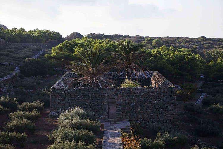 Il giardino pantesco è costruzione tipica atta a proteggere la pianta di agrumi. Sovente ha forma circolare ed è posto a protezione e custodia di una sola pianta. Qui, in tenimento Cantine Pellegrino, caso pressoché unico, la pianta è rettangolare e le possenti mura di questo giardino pantesco proteggono otto alberi di limone e due palme. Altro tesoro disvelato.