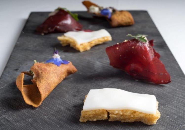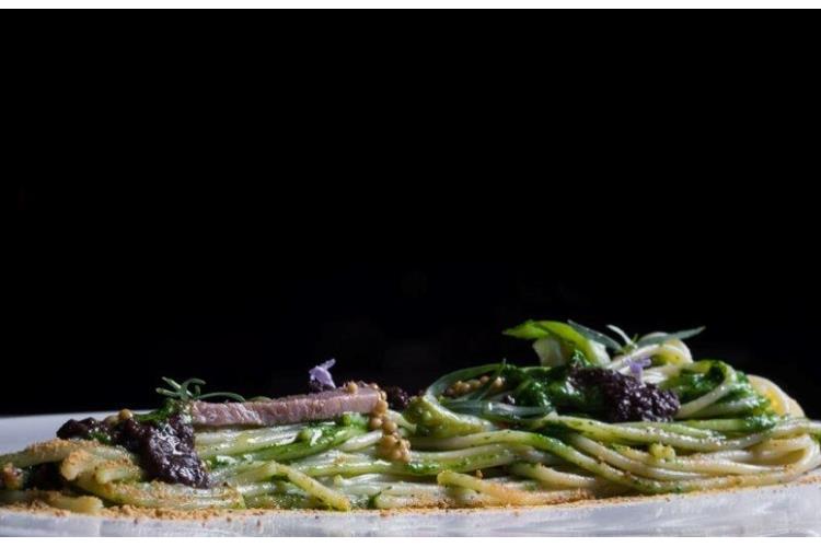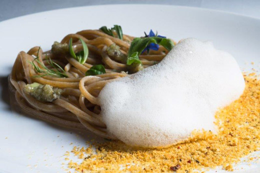 Tra i piatti che più ci hanno colpito citiamo: Zucca, zola e zenzero (cappelletti alla bourguignonne); “Pasta al mare” (linguine di farro con spiaggia, profumi e frutti di mare); Branzino selvaggio dell’Adriatico cotto sul fuoco, acciuga, oliva e broccoletti; Gallinella di mare e ortaggi verdi in brodetto allo zafferano; Piccione arrostito, rabarbaro fresco e foie gras; Maialino da latte croccante, tamarindo e pinzimonio; Passato di cachi al limone, piccoli frutti e sorbetto; Meringata ai marroni piemontesi con gelato al succo d’acero; Erbe e polveri del mondo.