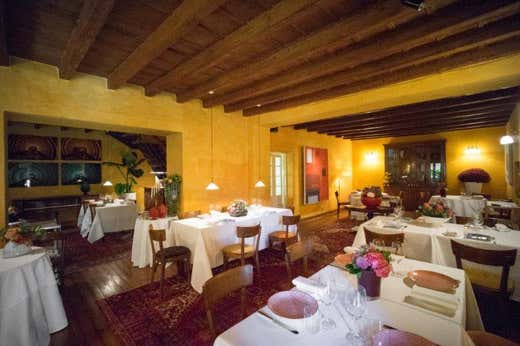 Un ambiente caldo e accogliente, rustico ed elegante allo stesso tempo, con luci soffuse, caminetto in pietra, un antico pianoforte, grandi tappeti decorati e antiche credenze che racchiudono ceramiche artigianali decorate a mano. Sorta all’interno di una grande casa di campagna ristrutturata a Villa d’Almè, a pochi chilometri da Bergamo, l’Osteria della Brughiera dal 1991 è sicuramente una delle stelle più luminose del firmamento della ristorazione orobica. Al timone c’è