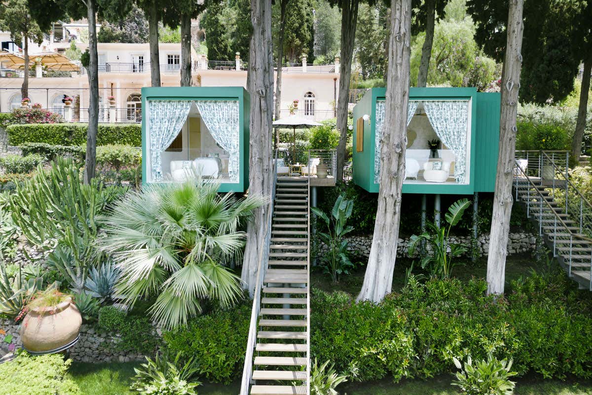 Progettate da Thirtyone Design + Management, entrambe le cabine vantano un terrazzo privato con una splendida vista sul mare, abbellito da elementi verdi. Qui trovano posto un ombrellone in tessuto coordinato con l'arredamento interno e poltroncine in rattan, offrendo agli ospiti la possibilità di prolungare l'esperienza di benessere in un'atmosfera di tranquillità assoluta. Gli ospiti del Grand Hotel Timeo che desiderano vivere un'esperienza unica vengono invitati a salire una scala in legno per accedere a due meravigliose cabine per trattamenti, una doppia e una singola, immerse tra i cipressi. I cubi che le ospitano sono realizzati interamente in legno e sono adornati da tende in toile de jouy che si abbinano alla tonalità verde circostante.