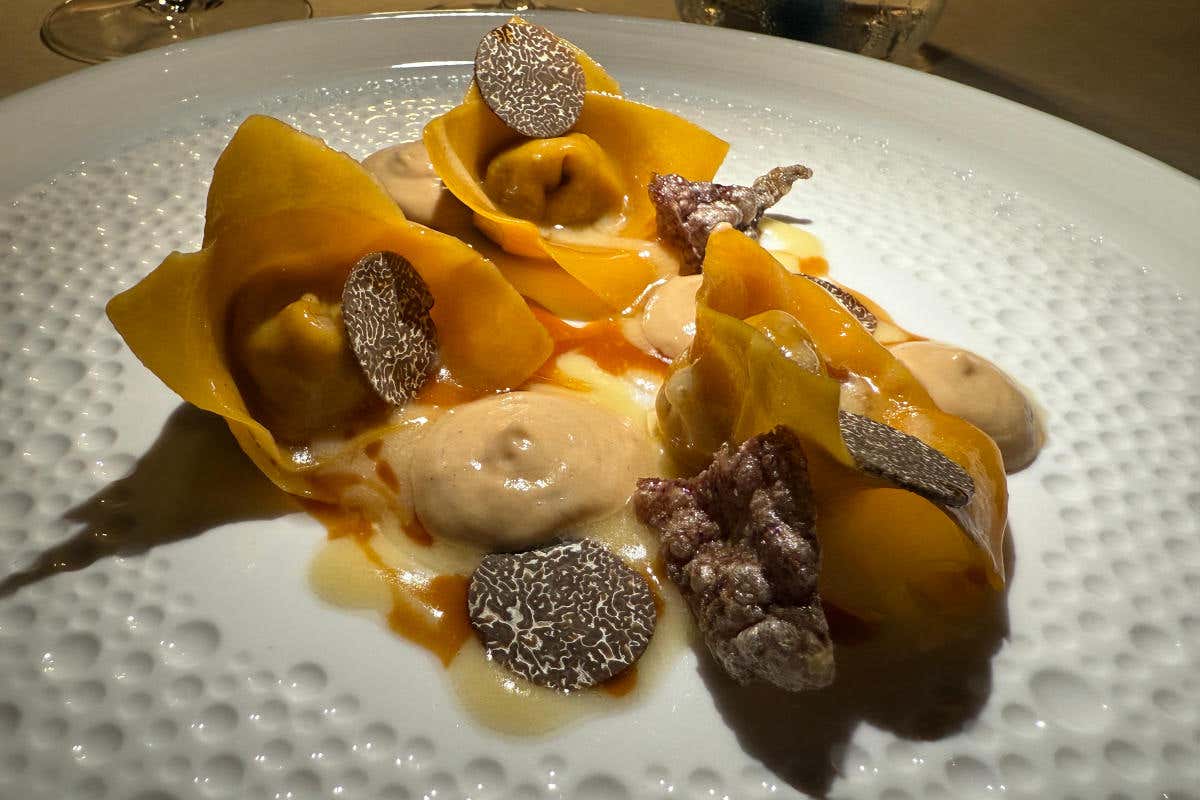 3. Estetica del piacere: cura certosina per la presentazione dei piatti, dove colori, forme e impiattamento contribuiscono a creare quella che molti definiscono un'esperienza multisensoriale, o più semplicemente il piacere di un piatto buono e che si presenta bene. Fra i più belli per noi ci sono certamente i Tortelli di corte Veronese, foie gras e tartufo nero (del menu Sinfonia Tradizione) che, come si può vedere nella foto di apertura, uniscono  colori invitanti la bontà di un ripieno dio animali di cortile (di bassa corte appunto) come faraona, coniglio, pollo, con tanto di durelli o alette. Molto interessante anche le Melanzane, con koji e sesamo bianco (Sinfonia Vegetale), dove la tecnica è decisamente ben impiegata in una preparazione innovativa.