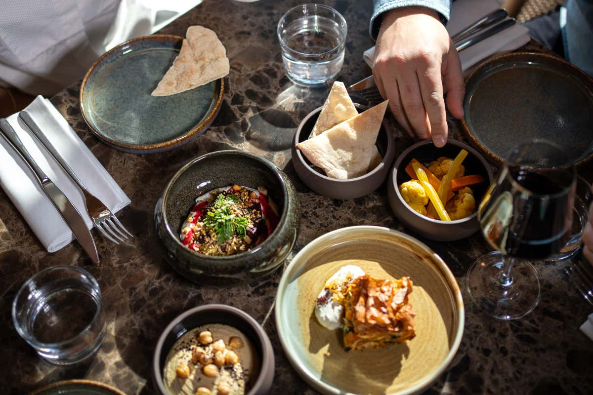 Ogni elemento è un richiamo a luoghi lontani: i colori caldi di terre rosse e sabbie dorate degli spazi ricordano un ambiente arioso, aperto, una terrazza mediterranea dove scoprire nuove ritualità. Il risultato è un approccio immediato alla cucina che ruota intorno ad un'ampia selezione di piatti a base vegetale nel nome della stagionalità, senza dimenticare pesce e carne (rigorosamente halal), proposte semplici, lavorate con grande cura per rivelare il gusto pieno di ogni ingrediente.