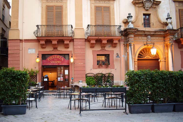 Posizione turistica ideale, nel centro storico di Palermo, di fronte alla Gam - Galleria di arte moderna, al piano terra del Palazzo Gangi, quello della famosa scena del ballo del Gattopardo, in mezzo ad altre imperdibili attrazioni: il viaggiatore almeno vi passerà davanti, in una storica piazzetta pedonale. L’Osteria dei Vespri, dell'osteria ha solo l’arredamento semplice, quasi rustico, qualche volta con sedie e tavoli ricoperti da eleganti drappi, ma come ristorante è uno dei più conosciuti ed apprezzati di Palermo, consigliato in tutte le guide, anche come cantina - con oltre 650 etichette è la più fornita. Titolari i fratelli Rizzo, Alberto in cucina, Andrea agli approvvigionamenti e vini.
