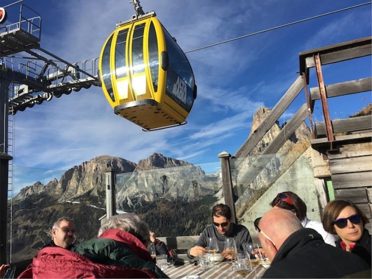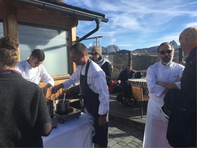Il percorso gastronomico sugli sci potev ainziiare dove si voleva, noi abbiamo seguito un itinerario che è iniziato al rifugio Col Alt dove Norbert Niederkofler (il cuoco di riferimento di tutto il territorio) del Ristorante St. Hubertus del Relais & Chateaux Hotel Rosa Alpina di San Cassiano ha preparato un'intrigante Zuppa di vino con crostini alle erbe, salmerino marinato su bruschetta di patate. Insieme a lui al rifugio Col Alt ha cucinato anche Alois Vanlangenaeker del ristorante Zass del San Pietro di Positano, che ha deliziato gli ospiti con un piatto tipico della Campania: Linguine al limone con cozze, bottarga e pane croccante di Agerola.