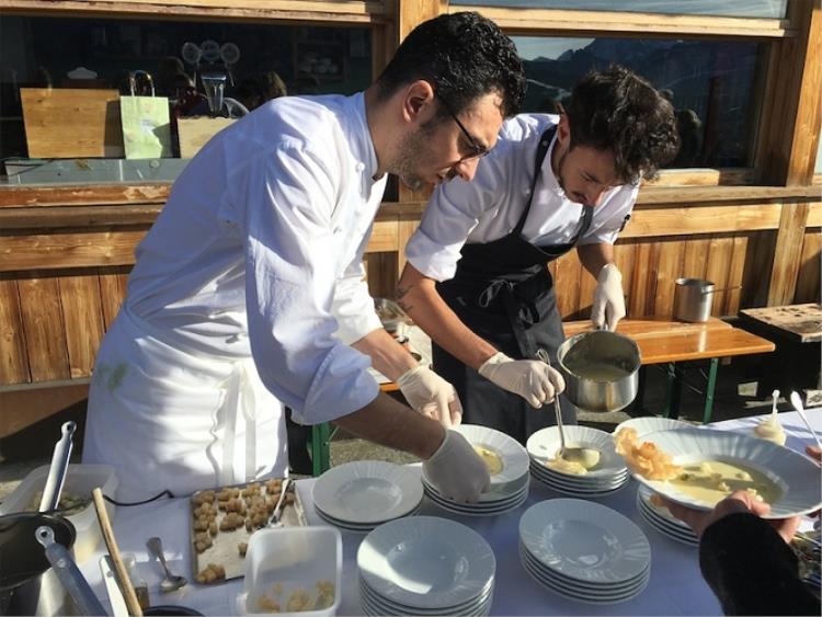 Il percorso è continuato al rifugio Piz Arlara dove Matteo Metullio (nella foto a sinistra), del Ristorante La Siriola dell’Hotel Ciasa Salares di San Cassiano, ha scelto di preparare un originalissimo tortello al caprino su purè di rape rosse, arachidi e ragù di maialino da latte. Allo stesso rifugio, Chris Oberhammer (nella foto a destra), del ristorante Tilia di Dobbiaco, ha optato invece per un tradizionale e gustosissimo Orzotto del molino di Villabassa con maialino nostrano e maggiorana. Al rifugio I Tablá è stato poi possibile incontrare lo chef pugliese Angelo Sabatelli dell’omonimo ristorante di Monopoli, che per l’occasione ha creato spaghetti aglio, olio, peperoncino e capesante con salsa di marasciuolo (rapa selvatica).