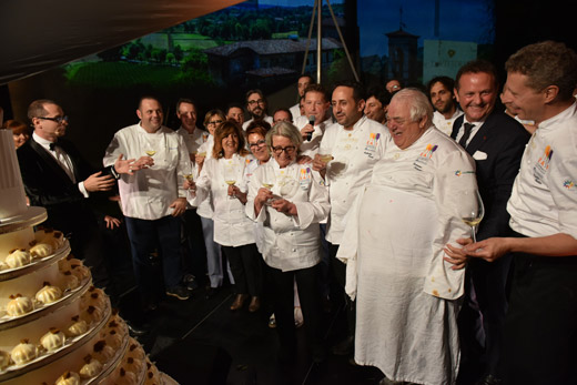 A fare da sfondo a queste prestigiose celebrazioni, le 20 creazioni culinarie di altrettanti chef: Paolo Benigni, dell’Osteria della Brughiera (1 stella Michelin) a Villa d’Almè (Bg); Gionata Bignotti, de La Rucola (1 stella Michelin) a Sirmione (Bs); Vera Caffini, dell’Aquila Nigra (1 stella Michelin) a Mantova; Riccardo Camanini, del Lido 84 (1 stella Michelin) a Gardone Riviera/Fasano (Bs); Stefano Cerveni, del Due Colombe (1 stella Michelin) a Corte Franca/Borgonato (Bs); Marco e Vittorio Colleoni del San Martino (1 stella Michelin) a Treviglio (Bg); Daniel Facen del A’anteprima (1 stella Michelin) a Chiuduno (Bg); Massimo Fezzardi, del Esplanade (1 stella Michelin) a Desenzano del Garda (Bs); Orietta e Maria Filippini, de La Tortuga (1 stella Michelin) a Gargnano (Bs); Paolo Frosio, del Frosio (1 stella Michelin) ad Almè (Bg); Giuliana Germiniasi, del Capriccio (1 stella Michelin) a Manerba del Garda (Bs); Mariapaola Geroldi del Gambero (1 stella Michelin) a Calvisano (Bs); Philippe Léveillé del Miramonti l’Altro (2 stelle Michelin) a Concesio (Bs); Alfonso Pepe del Leon d’Oro (1 stella Michelin) a Pralboino (Bs); Roberto Proto de Il Saraceno (1 stella Michelin) a Cavernago (Bg); Pierantonio Rocchetti de LoRo (1 stella Michelin) a Trescore Balneario (Bg); Romano Tamani dell’Ambasciata (1 stella Michelin) a Quistello (Mn); Loredana Vescovi dell’Antica Osteria dei Cameli (1 stella Micheli) ad Ambivere (Bg); Nadia Vincenzi, del Da Nadia ( 1 stella Michelin) a Castrezzato (Bs).