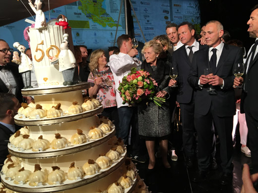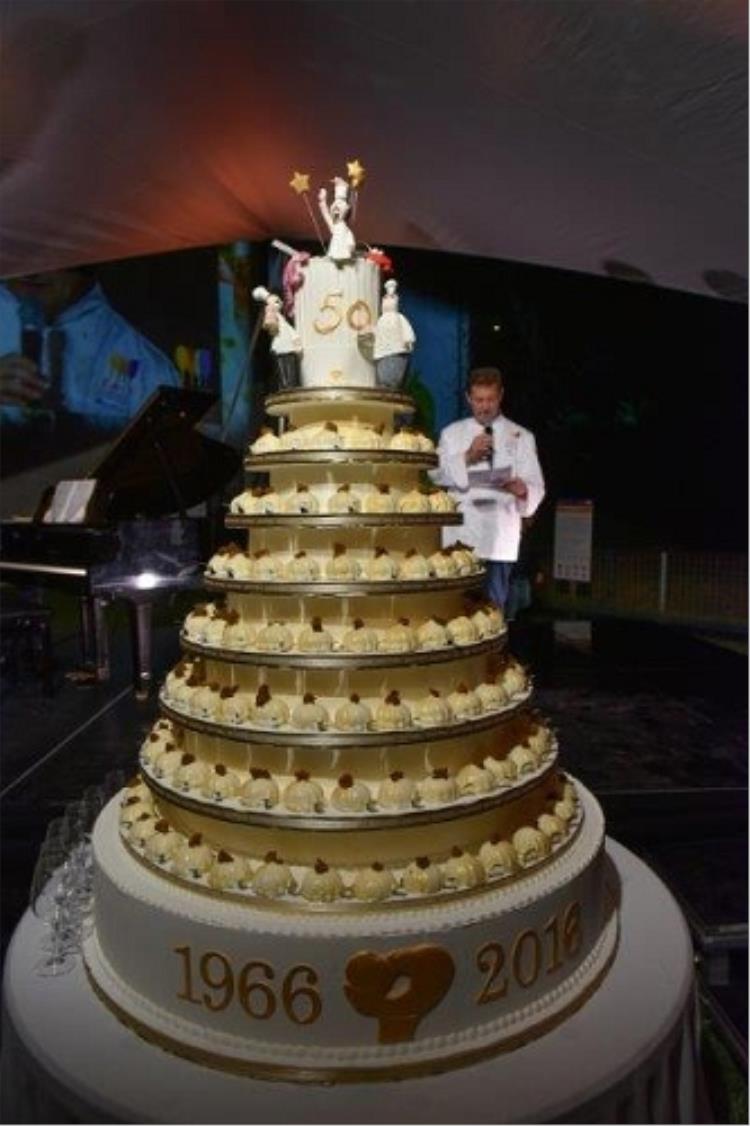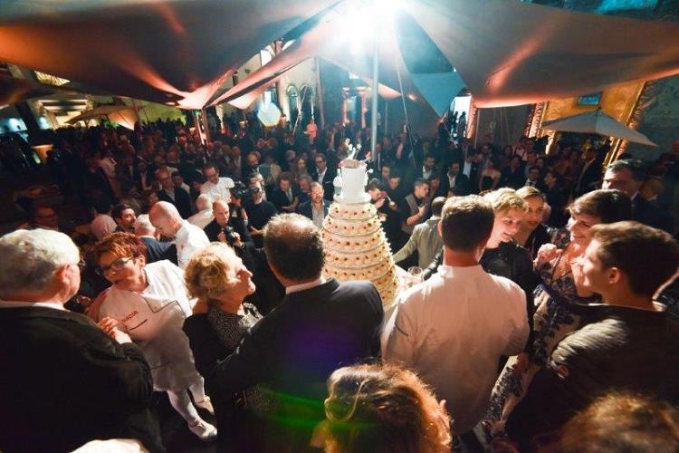 Tra la gioia e la commozione del momento, ha fatto il suo ingresso della torta a sette piani dedicata ai 50 anni del ristorante Da Vittorio, una rivisitazione del classico Tiramisù che Enrico Cerea ha scelto di chiamare Torta Gioconda in onore della mamma, che in realtà si chiama proprio Gioconda. Sulle mura dell'ex monastero sono state proiettate le immagini di quello che stava avvenendo sul palco (coperto a casusa del maltempo).