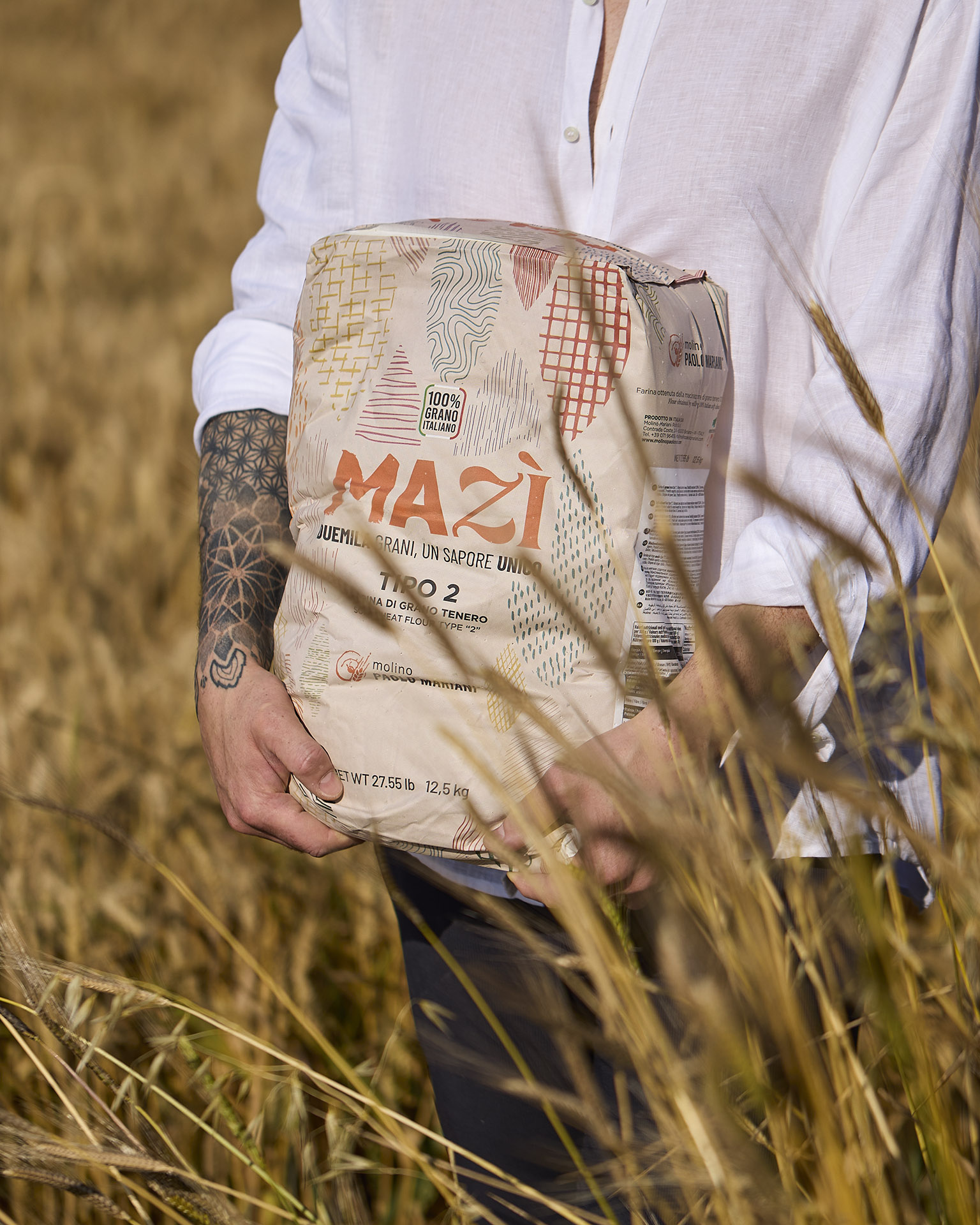 Mazì — che in greco significa insieme — è una farina di tipo 2 frutto di un miscuglio evolutivo composto da oltre 2.000 varietà di grano, selezionate nel tempo per adattarsi naturalmente al territorio marchigiano.