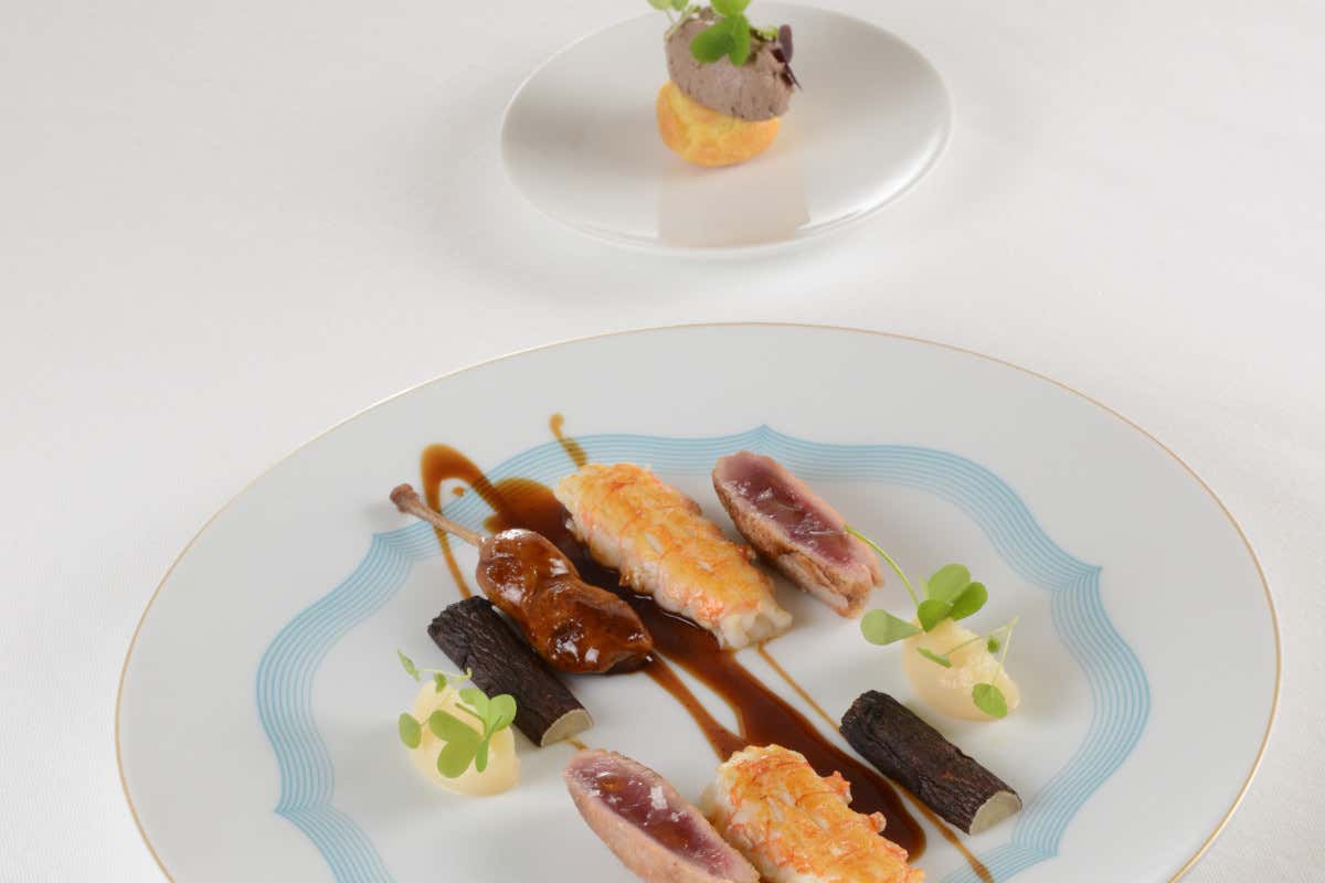 Quaglia in doppia cottura, scampi di Oneglia, scorzonera e ibisco