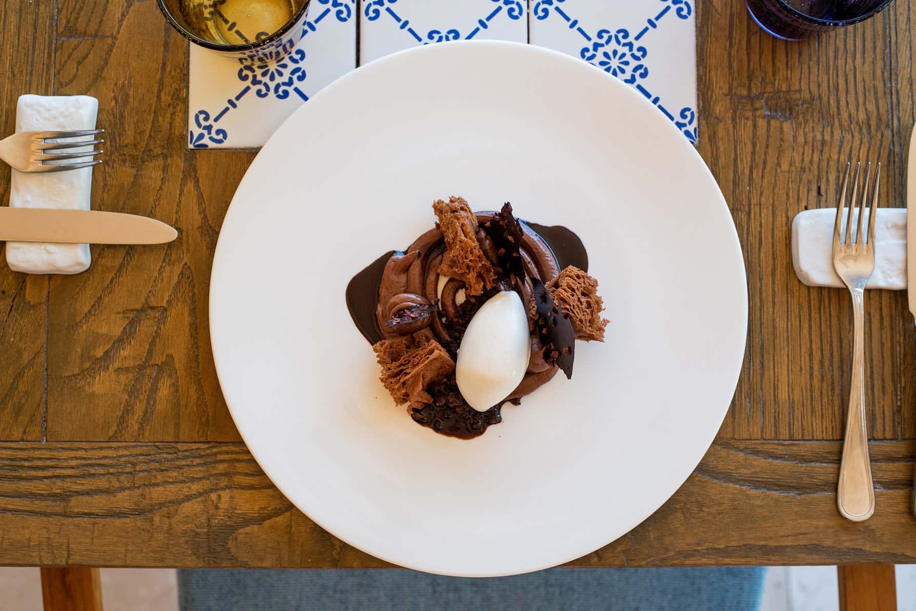 Alla base del piatto, fare una spirale con il cremoso di cioccolato fondente. Posizionare tre pezzi di spugna distanziati tra loro. Adagiare lo streusel e, sopra, una quenelle di sorbetto al cioccolato bianco. Terminare con tre pezzi irregolari di cialda al cacao e fave di cacao e dei punti di salsa al Guanaja.