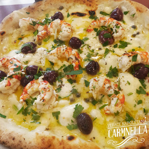Pizza condita con fiordilatte, olive, capperi, gamberoni, origano, olio evo, prezzemolo e buccia di limone.