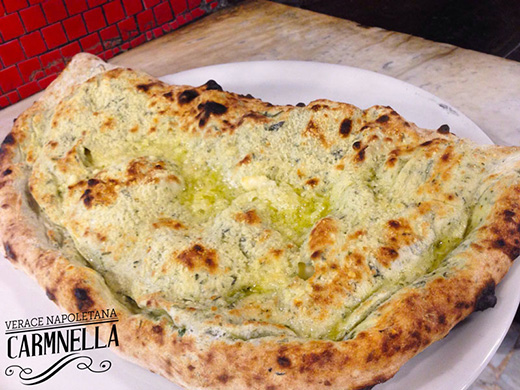 Pizza con impasto con i friarielli, ripiena con salsiccia e provola.