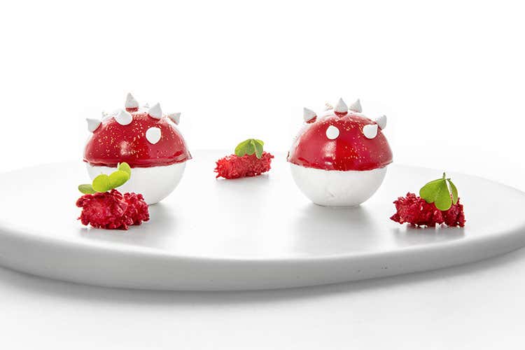 Montare lo zucchero semolato e l’albume, incorporare a mano lo zucchero a velo e con una sac à poche, riempire le mezze sfere in silicone. Disidratare in forno a 70°C per una notte. Con la meringa per la definizione con l’aiuto di una Sac a poche formare delle piccole gocce del diametro di 3 mm su tappetino in silicone e far disidratare a 50 °C per 2 ore.