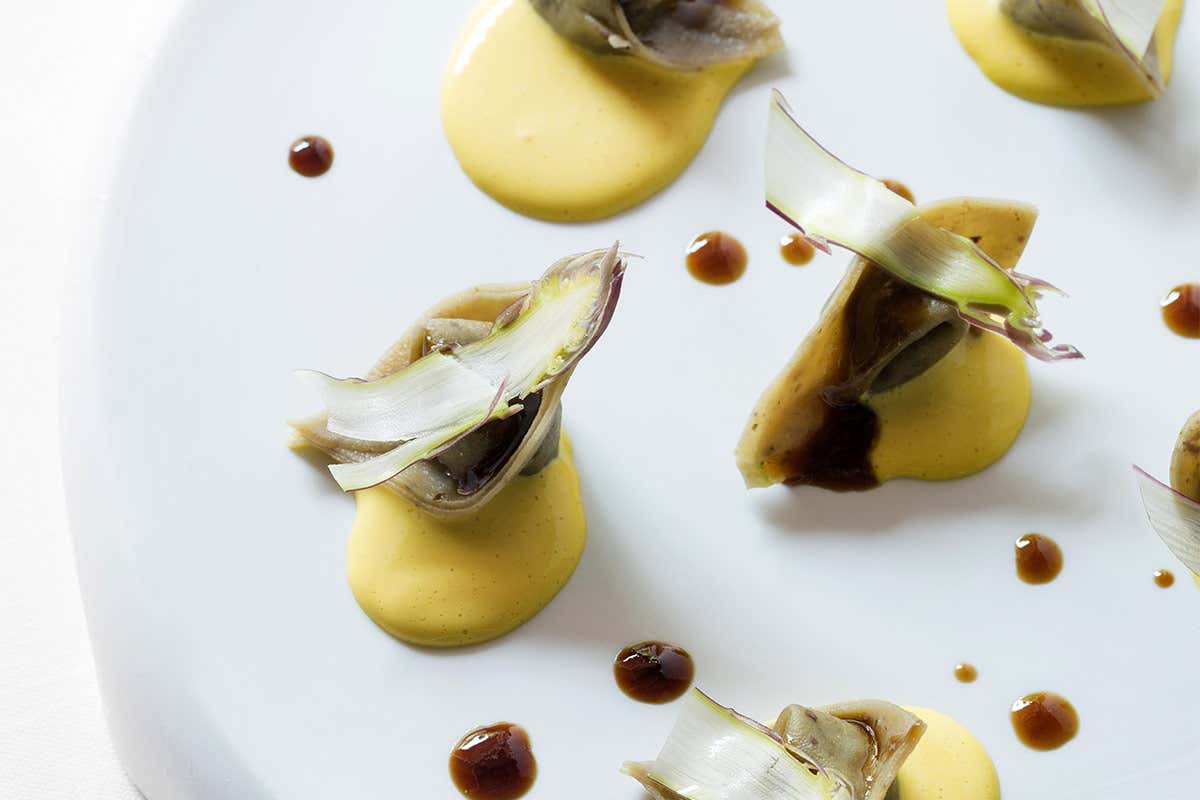 Ravioli di asparagi selvatici, zabaione di Parmigiano Reggiano