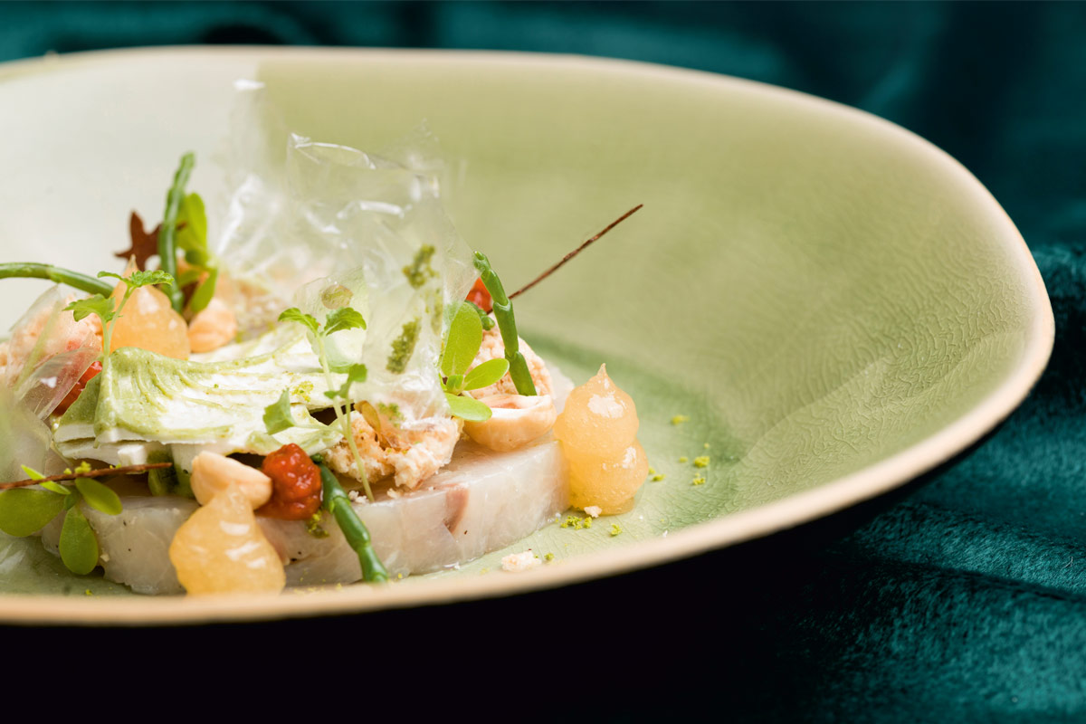 Posizionare al centro la tartare di ricciola, adagiare la foglia di cagliata di mandorle e posizionare degli spuntoni di gelal bergamotto. Posizionare intorno la foglia di cagliata, le nocciole tostate, i fogli di Obulato, gli asparagi di mare e lo Yuzu Kosho. Completare con i germogli di ravanello.