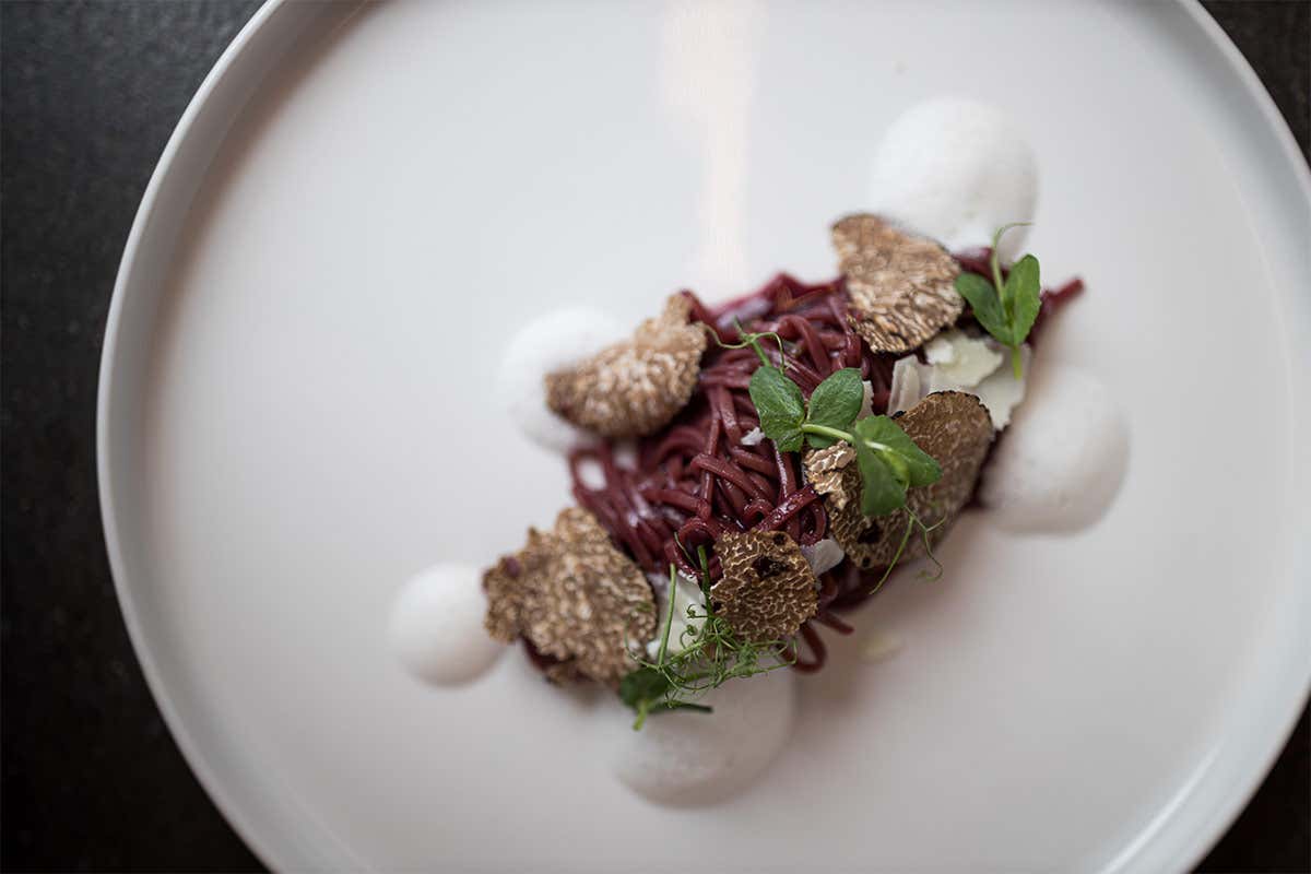 Preparazione della pasta. Mescolare gli ingredienti in una ciotola, aggiungere il vino rosso condensato e impastare. Coprire e lasciare riposare per circa un’ora. Stendere la pasta e tagliarla creando delle listarelle/tagliatelle. Cuocere al dente in acqua salata.