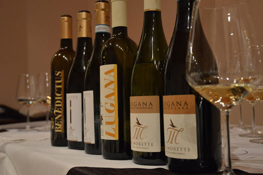 Vini bianchi che hanno mostrato subito la loro vera anima, perfettamente abbinati alle pietanze della cena, preparata dallo chef Corrado Fasolato: crudo e cotto di gamberi alla melissa, risotto mantecato con le patate, scampi e gelato di rafano (Lugana Benedictus), carpaccio di cervo, tataki di tonno, tartufo (Lugana Benedictus), anatra con purè alla menta leggera, rabarbaro e fegato grasso (Lugana Riserva), per concludere dolce e salato di mascarpone, olive, capperi e gelato di pistacchio (Accordo Passito). Il raffinato menu ha conquistato tutti e un caloroso applauso ha salutato il brillante chef, a fine cena.
