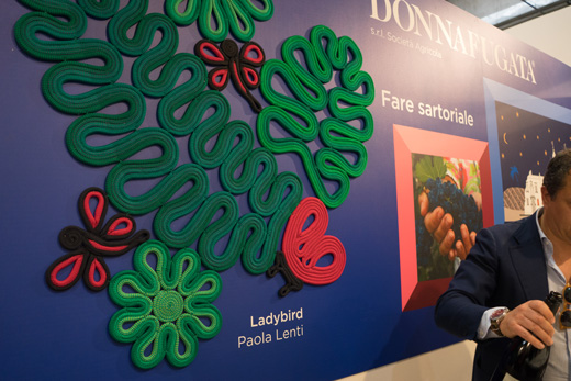 Ladybird e Bisanzio sono i due tappeti, frutto dell’estro di casa Lenti, che hanno impreziosito le pareti dello stand. Ladybird è un tappeto di 185x550 cm composto da singoli elementi in corda tinta unita e bicolore, volti a creare immagini di piante e animali, successivamente cuciti assieme agli altri per formare un prezioso decoro a parete. Bisanzio è invece realizzato dall’unione di elementi prodotti con corda tinta unita e colore, di circa 12x12 cm. Ogni elemento è poi unito sapientemente all’altro secondo uno schema ortogonale, con un filo tono su tono, per creare la suggestiva superficie mosaicata del tappeto della grandezza di 240X240 cm.